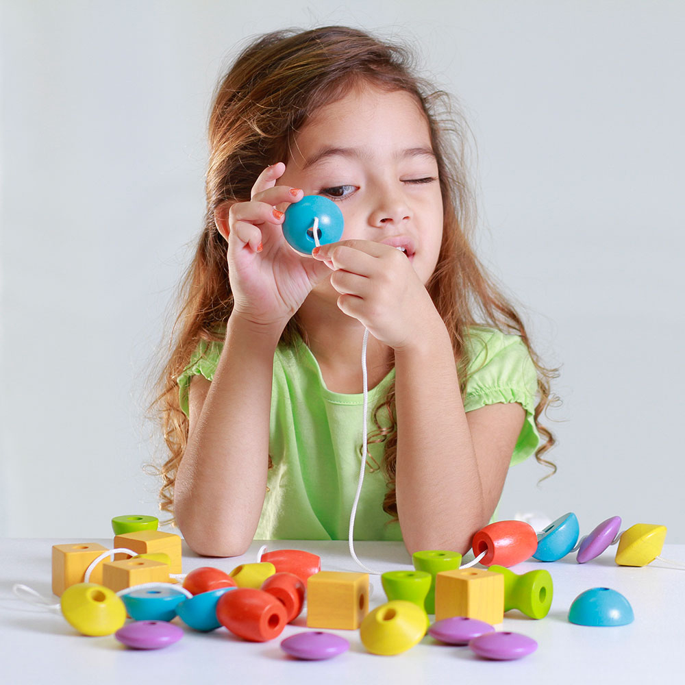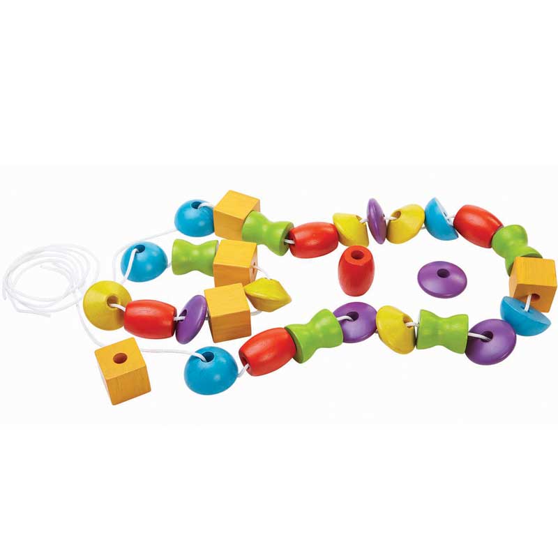Children can learn about colors, shapes, and sizes while developing motor skills. One set includes 2 laces and 30 wooden beads in 6 different shapes and colors.