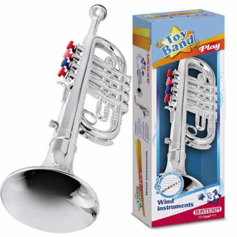 Τρομπέτα με 4 χρωματιστά πλήκτρα από την Bontempi και 3 νότες (MI,LA,DO,MI). Τα πλήκτρα έχουν διαφορετικά χρώματα που αριθμούνται, βλέπε στο πίσω μέρος της συσκευασίας που είναι 3,6,1 όσες και οι νότες, ώστε τα μικρά παιδιά να μπορούν να παίξουν τα τραγούδια RIN TIN TIN ROLE CALL, CHARGE που βρίσκονται στο πίσω μέρος της συσκευασίας. Είναι κατασκευασμένο απο πλαστικό υλικό που πληρεί τις προδιαγραφές της Ε.Ε μ'ένα γυαλιστερό ασημί φινίρισμα