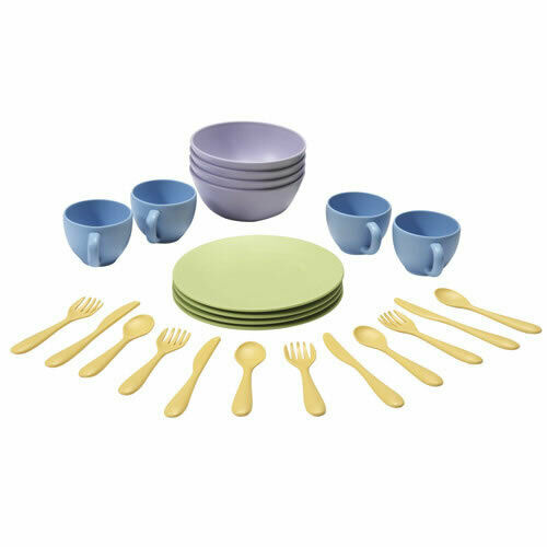 Σετ 24 τεμαχίων περιλαμβάνει: 4 φλιτζάνια, 4 πιάτα, 4 μπολ, 4 σετ σκευών (πιρούνι / μαχαίρι / κουτάλι). Είναι δείπνο με το πιο φιλικό προς το περιβάλλον σετ πιάτων στον κόσμο! Περιλαμβάνει ό, τι χρειάζεστε για να σερβίρετε ένα γεύμα για τέσσερα άτομα και να κάνετε κάτι υπέροχο για τον πλανήτη. Το Green Toys Dish Set είναι κατασκευασμένο στις ΗΠΑ από 100% ανακυκλωμένα πλαστικά δοχεία γάλακτος που εξοικονομούν ενέργεια και μειώνουν τις εκπομπές αερίων του θερμοκηπίου.