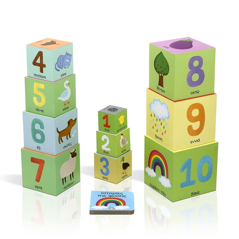 Διαβάστε το βιβλιαράκι που θα βρείτε στο κουτί και τοποθετήστε µαζί µε το παιδί σας τους 10 κύβους, τον έναν πάνω στον άλλον, για να φτιάξετε έναν εντυπωσιακό πύργο! Το µικρό σας θα μάθει τα σχήµατα, τα χρώματα και τους αριθµούς, και θα ανακαλύψει τη φύση και τα ζώα της φάρμας.