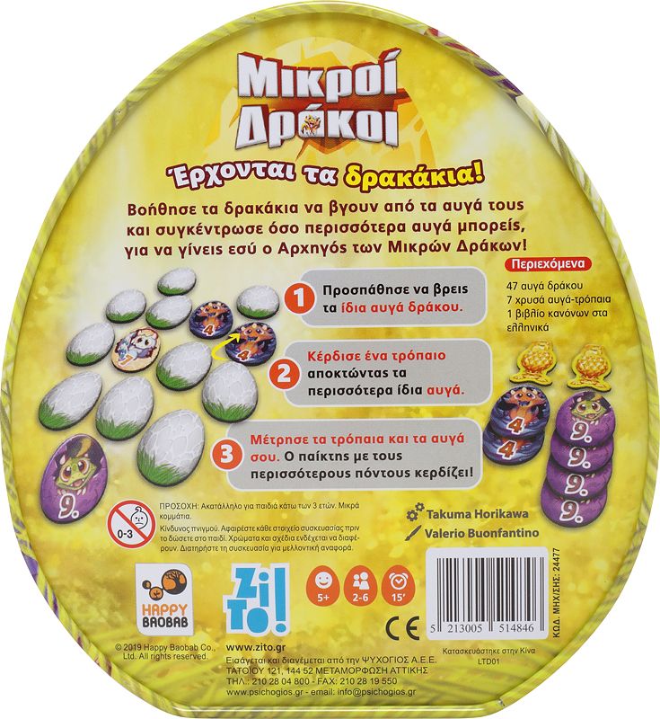Περιεχόμενα: 47 αυγά δράκων, 1 χρυσό αυγό-τρόπαιο, 1 βιβλίο κανόνων Το παιχνίδι είναι κατάλληλο για 2-6 παίκτες άνω των 5 ετών. Μέση διάρκεια παιχνιδιού 15 λεπτά
