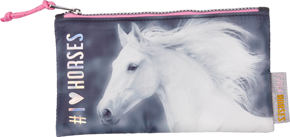 Ασημένια γκρι θήκη για όλες τις χρήσεις για στυλό και άλλα μικρά αντικείμενα. Με ένα μαγικό άλογο μοτίβο και “I Love Horses” εκτύπωση σε μια αφρώδη ολογραφική ταινία.